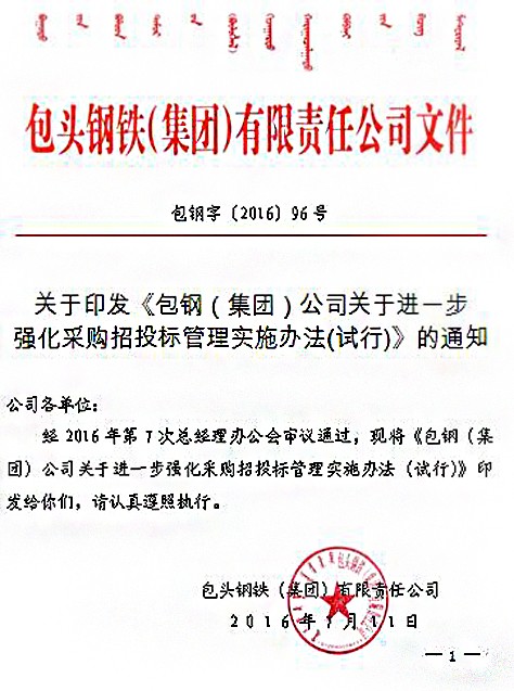 下一條:關于印發(fā)《包鋼(集團)公司關于進一步強化采購招投標管理實施辦法(試行)》的通知